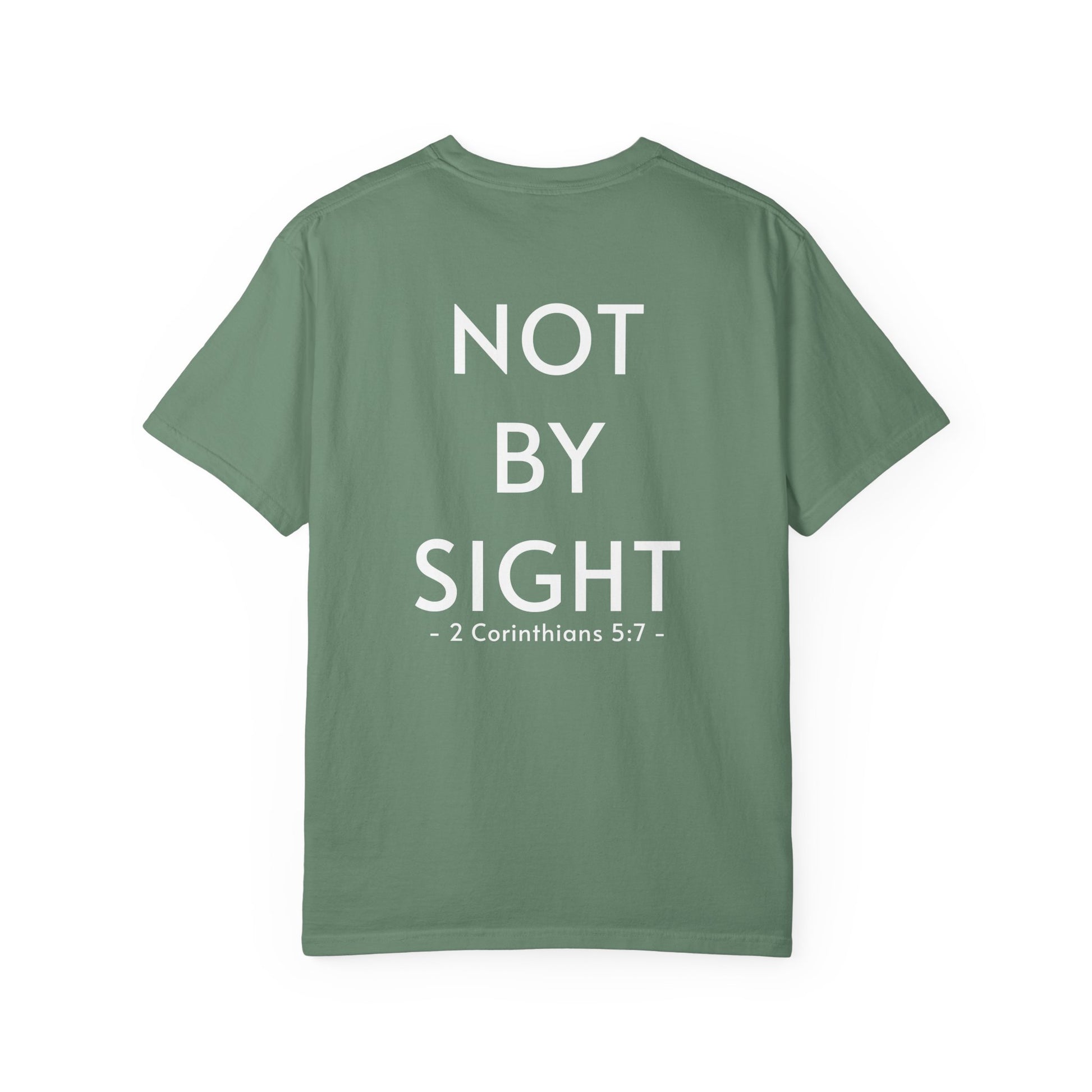 This shirt features the verse from 2 Corinthians 5:7, "for we walk by faith, not by sight." The first part of this message is on the front, with the remaining portion appearing on the back of the t-shirt.