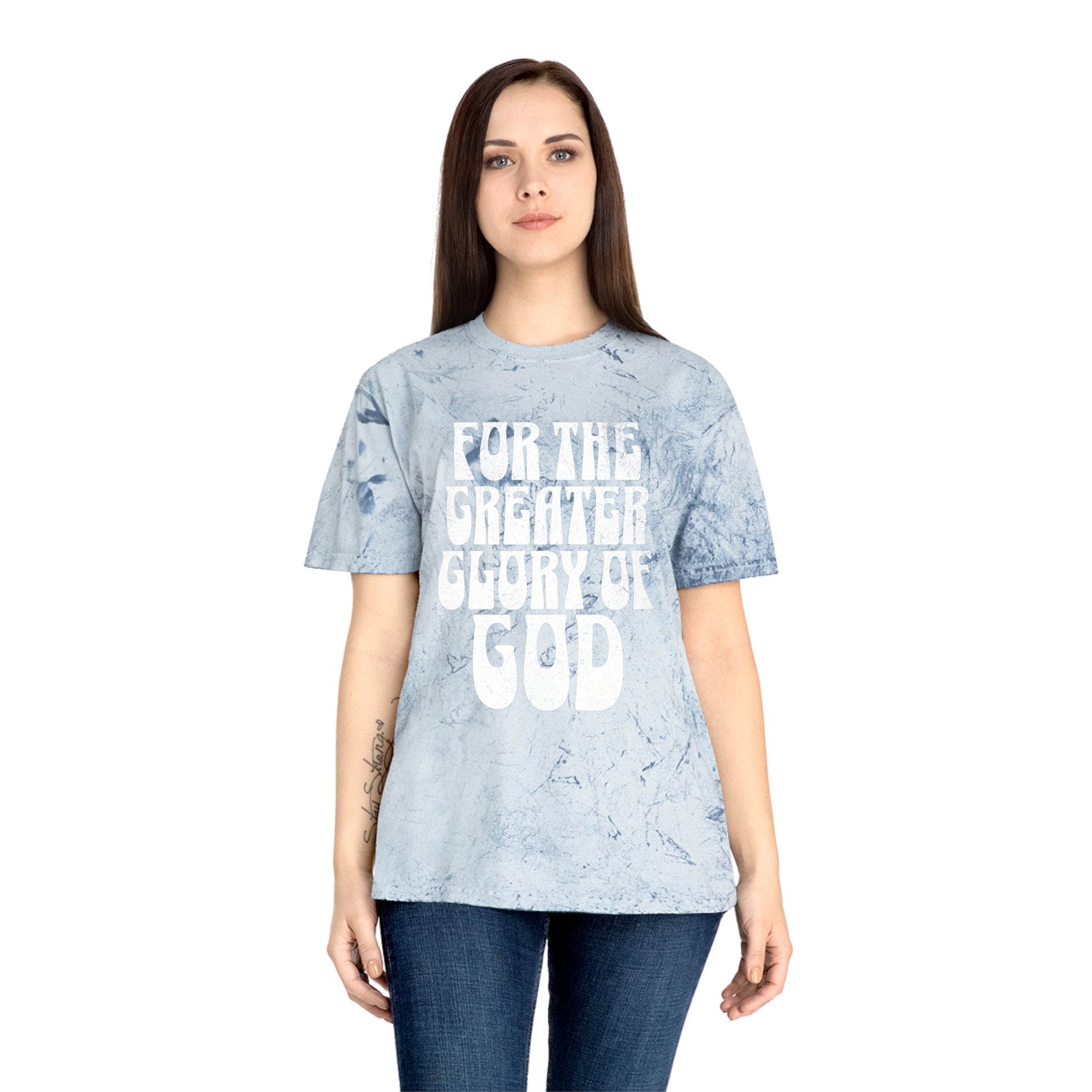 This simple but powerful shirt message comes from AMDG, Ad Majorem Dei Gloriam - for the greater glory of God. It is a much needed reminder that everything we do is for His glory - have courage and let your actions glorify God. It has the same message as the other shirt in my shop, just in a subtle tye dye pattern shirt with bubble font!