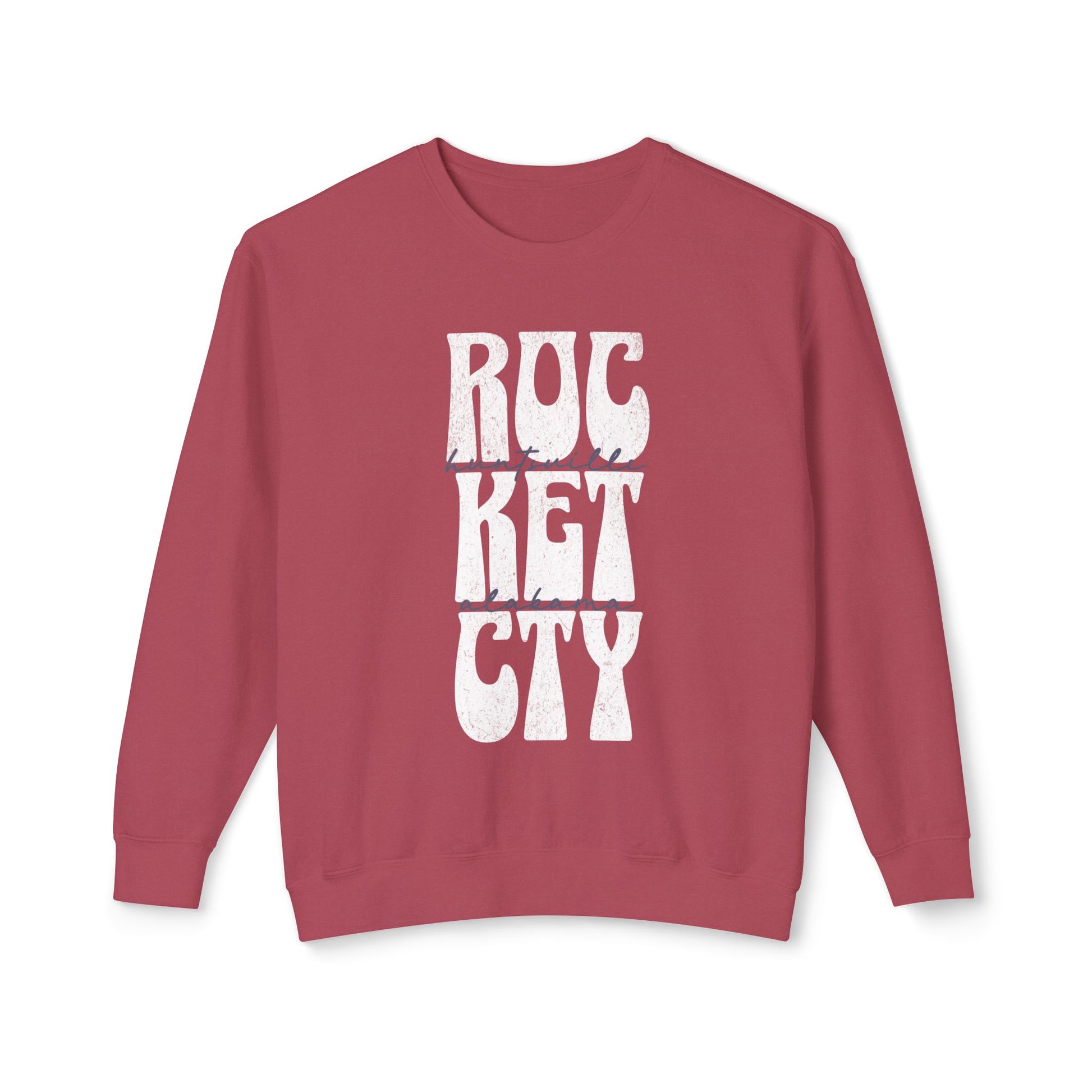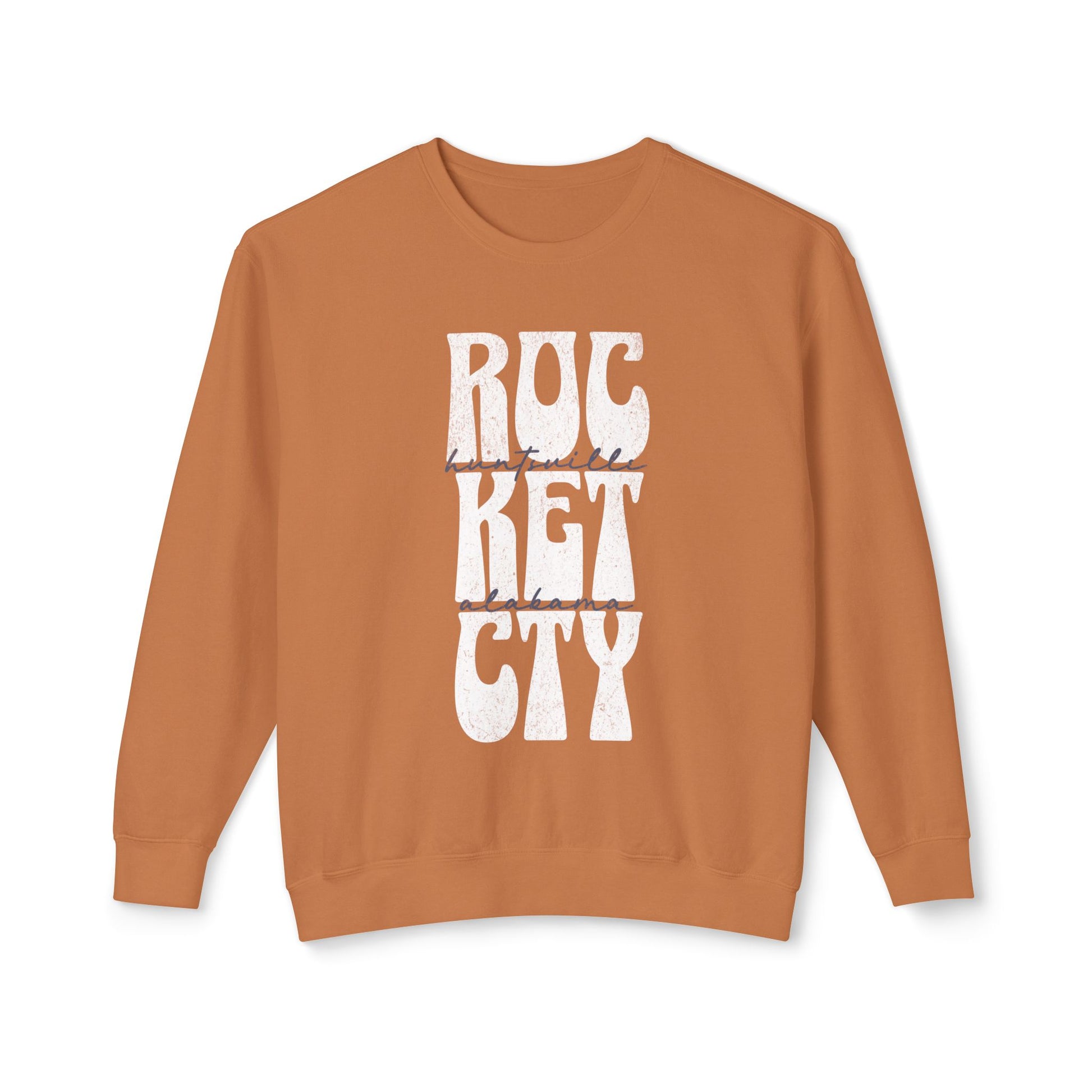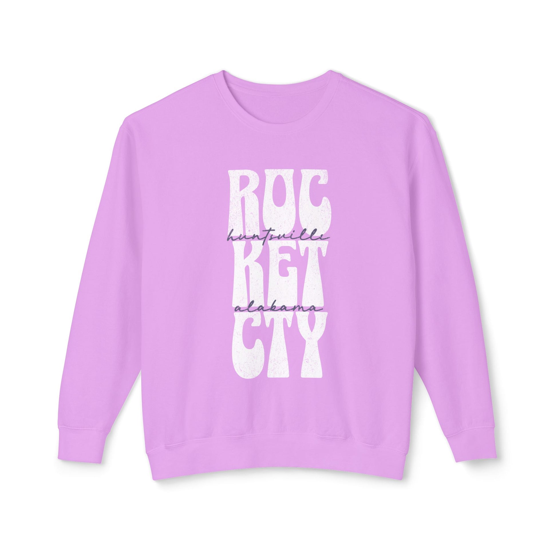This sweatshirt features fun bubbly letters highlighting Huntsville, AL - Rocket City (city abbreviated to cty as part of this style/design). Printed on the Comfort Colors lightweight sweatshirt, it's cozy and perfect for seasonal transition!