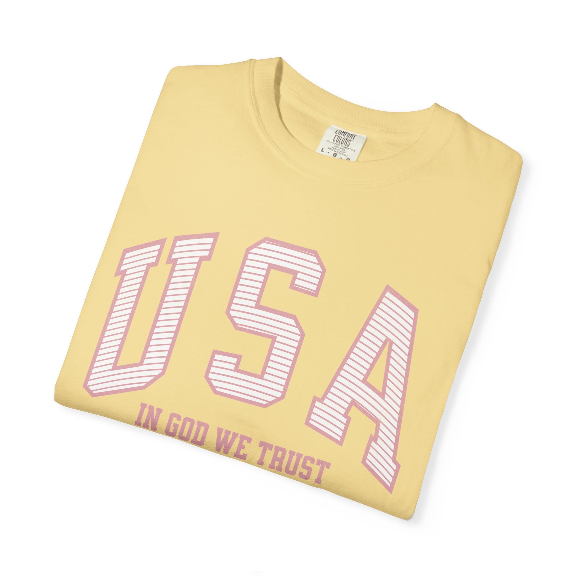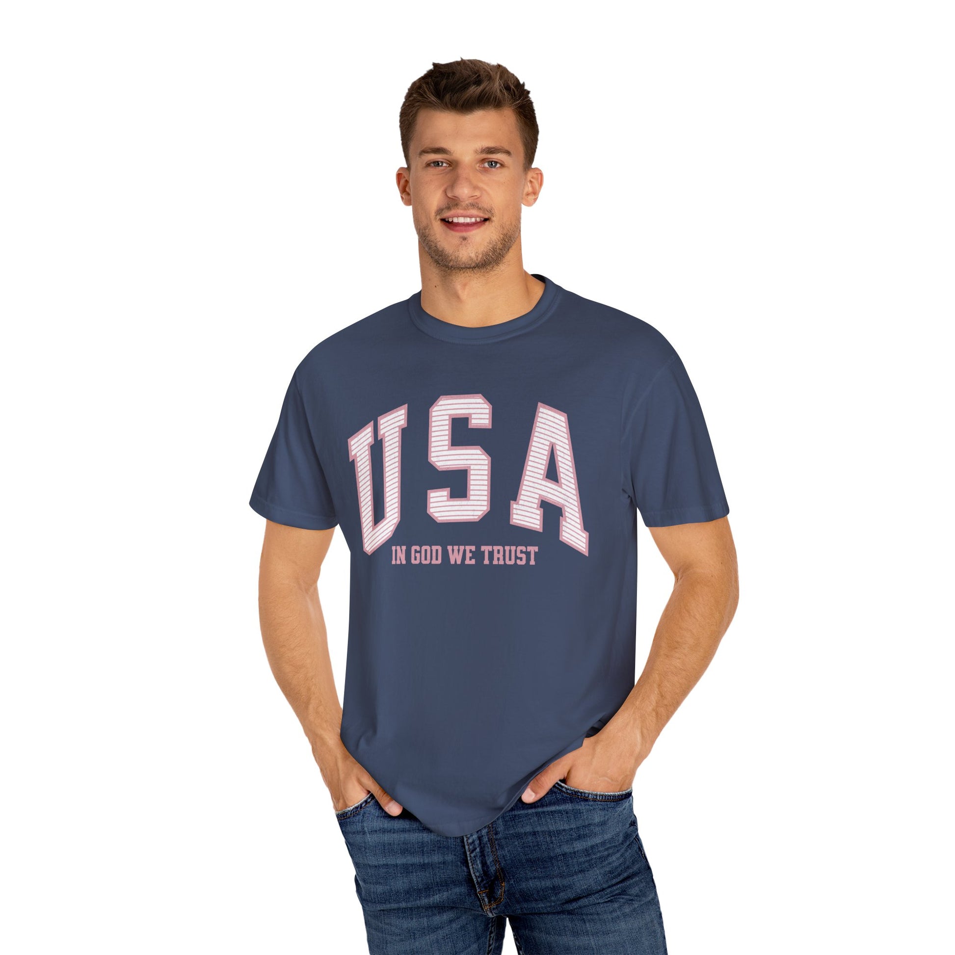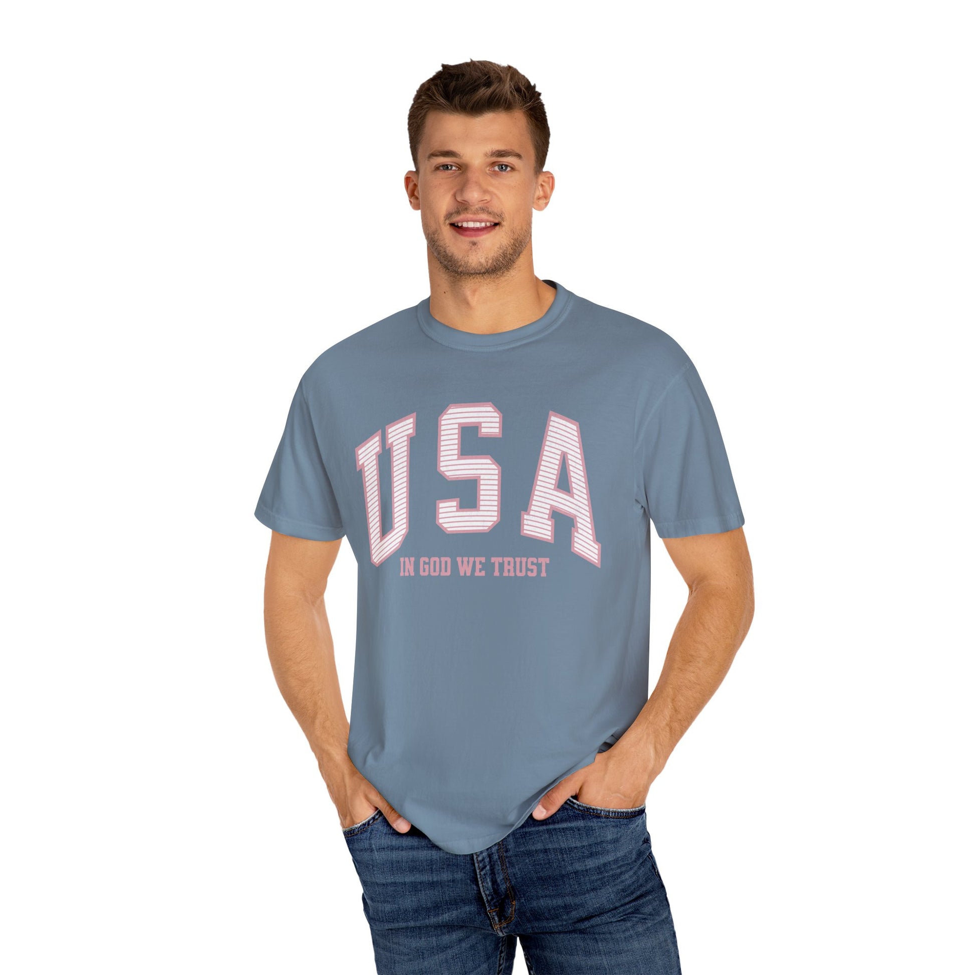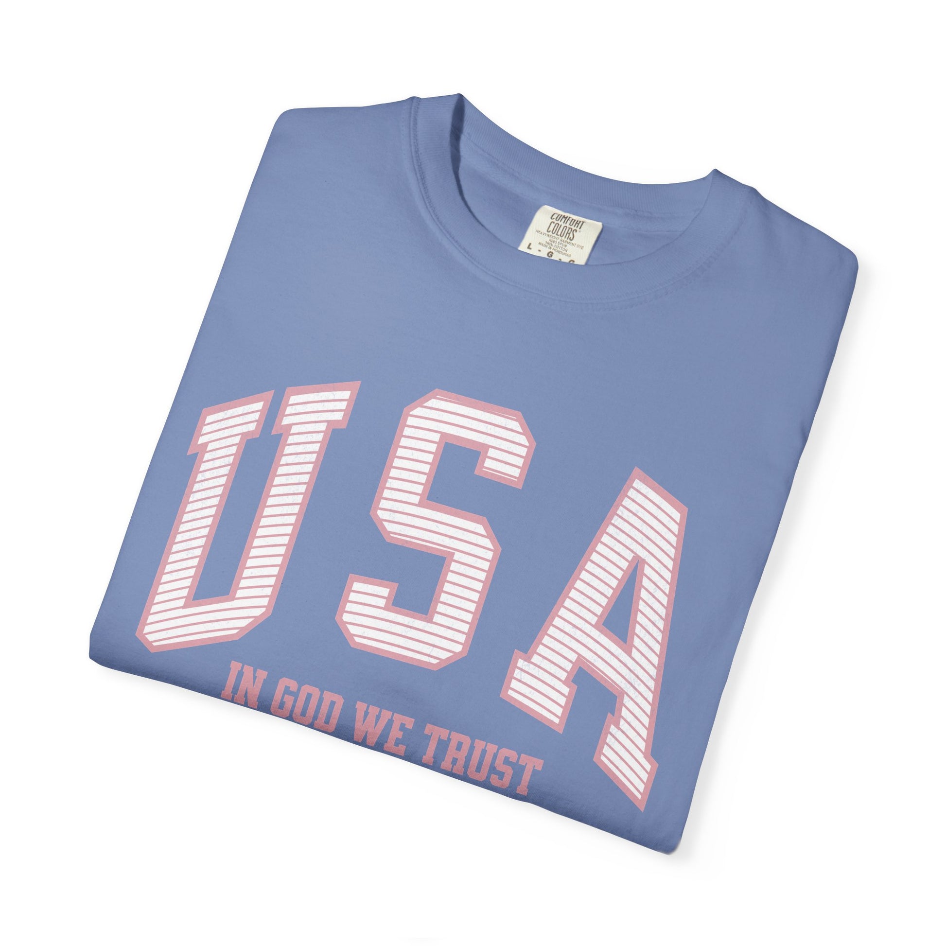 This shirt features a striped (light distressing) soft red/pink USA on the front, with In God We Trust beneath. As we approach the US's 250th birthday in 2026, grab this shirt to show your love for God and country.